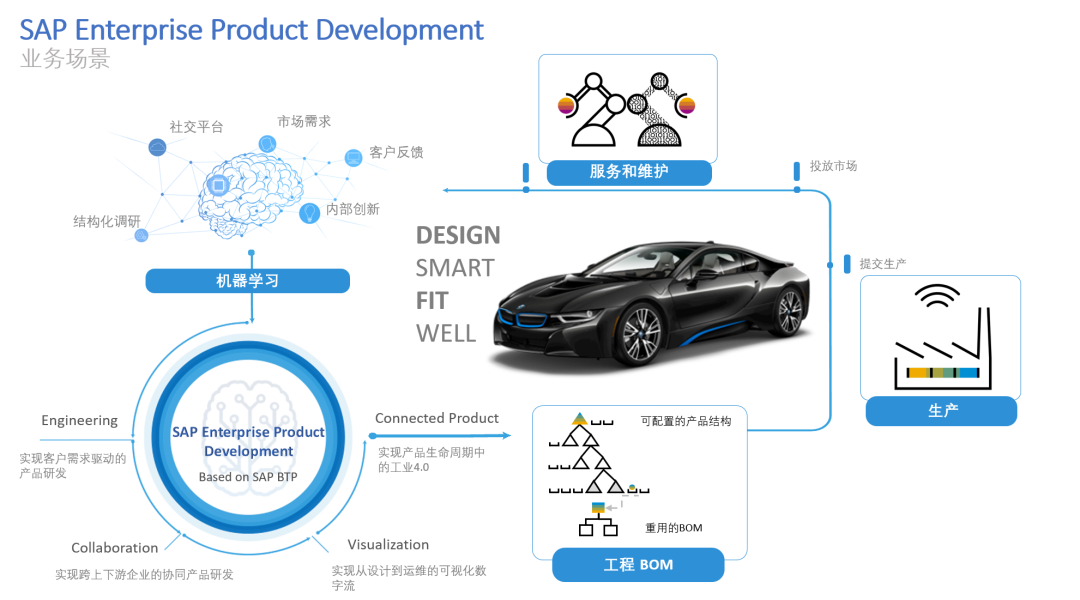SAP EPD 是一个集成的产品生命周期管理云解决方案,它利用机器学习技术,可自动识别,分类和分析产品反馈。基于分析结果,产品研发部门可以更轻松地将客户反馈转化成产品需求,搭建系统模型,进行模拟仿真及测试,生成工程物料清单,进而提交生产,投放市场, 最后进入运维阶段。